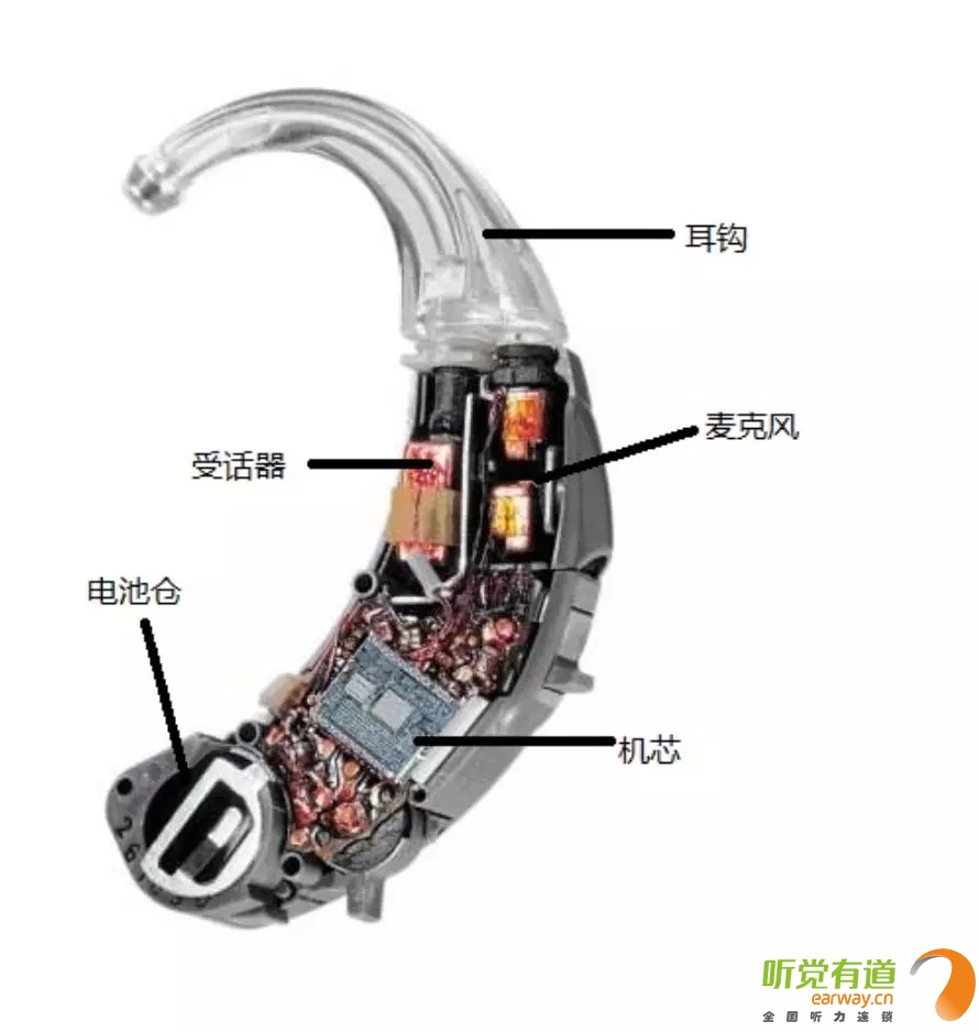 <span style="font-size:16px;"> 在助聽器發展過程中,出現過很多種助聽器,比如:盒式、眼鏡式、耳背式、耳甲腔式、耳道式、深耳道式等定制式助聽器。如今盒式助聽器、眼鏡式助聽器等幾乎已退出歷史舞臺,現在常見的助聽器有耳背式助聽器、定制式助聽器和RIE受話器外置式助聽器。</span></p><p style="text-align: center;"><span style="font-size:16px;"><img src="/upfiles/201808160127045435.jpg" width="640" alt="" /><br /></span></p><p><span style="font-size:16px;"> 接下來,我們將以耳背式助聽器為例,向您介紹助聽器的外部配件及內部構造!</span></p><p><span style="font-size:16px;"> 1、機身內部構造</span></p><p style="text-align: center;"><span style="font-size:16px;"><img src="/upfiles/201808160127276133.jpg" width="640" alt="" /><br /></span></p><p><span style="font-size:16px;"> 麥克風:獲取聲音并將聲音信號轉化為電信號。</span></p><p><span style="font-size:16px;"> 機芯:將電信號進行放大、處理,機芯包含放大器、音量調控電位器、微調電位器等。</span></p><p><span style="font-size:16px;"> 受話器:將電信號轉化為聲音信號,通過導聲管和耳模傳送給耳朵。耳背式助聽器和定制式助聽器的受話器都在機身內;RIE受話器外置式助聽器的受話器放置在耳道中。</span></p><p><span style="font-size:16px;"> 電池倉:用于安放電池來供電,使助聽器正常工作。</span></p><p><span style="font-size:16px;"> 2、電池</span></p><p><span style="font-size:16px;"> 電池放置于電池倉內,給予助聽器能量。市面上常見的助聽器電池分為4類:</span></p><p><span style="font-size:16px;"> A675:一般用于超大功率耳背式助聽器。</span></p><p><span style="font-size:16px;"> A13:一般用于標準耳背式或耳甲腔式助聽器。</span></p><p><span style="font-size:16px;"> A312:一般用于耳道式助聽器。</span></p><p><span style="font-size:16px;"> A10:一般用于深耳道式助聽器。</span></p><p><span style="font-size:16px;"> 電池大小:A675>A13>A312>A10,電池越大,儲存能量越多。</span></p><p><span style="font-size:16px;"></span></p><p> 更多詳情請登錄www.yskoucai.com。</p>" />