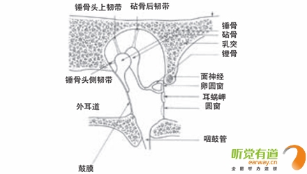 <span style="font-size:16px;"> 中耳結(jié)構(gòu)包括鼓室、咽鼓管、鼓竇和乳突腔四部分。鼓室內(nèi)有聽骨、肌肉、韌帶和神經(jīng)。中耳是換能器,換能是將一種能量形式轉(zhuǎn)換成另一種能量形式,中耳通過鼓膜和聽骨鏈將聲能轉(zhuǎn)換為機(jī)械能,再由鐙骨底板將機(jī)械能轉(zhuǎn)換為內(nèi)耳的液態(tài)能。</span></p><p><span style="font-size:16px;"> 鼓膜是中耳和外耳的分界,呈橢圓形,中間稍向內(nèi)凹陷,色灰白,較透明,與耳道底約呈30°角。鼓膜寬約8mm,高約9mm,厚0.1mm,質(zhì)地韌,其構(gòu)造分三層:外層是皮膚層,中層由淺層的放射狀和深層的環(huán)狀纖維組成,它們使得鼓膜能承受一定的氣壓和水壓并抗感染,內(nèi)層為粘膜層,與鼓室粘膜相連續(xù)。聲音的振動(dòng),即聲能,通過耳郭和耳道共振的加強(qiáng),引起鼓膜隨之振動(dòng),鼓膜與中耳的錘骨相連,在正常耳,錘骨懸掛在自鼓膜頂端至下2/3處。錘骨柄的尖端將鼓膜頂向中耳,形成錐形鼓膜的頂,稱作臍。自臍向前下達(dá)鼓膜邊緣有一個(gè)三角形的反光區(qū),名光錐,是外來光線被鼓膜的凹面集中反射而成。鼓膜下4/5為緊張部,上1/5由于缺乏纖維層而較松馳,稱為松弛部。鼓膜可分為前上、前下、后上、后下四個(gè)象限。兒童的鼓膜薄而有彈性,年齡越大,鼓膜越厚且越僵硬。鼓環(huán)將鼓膜固定在某一位置,使其成為在外耳和中耳之間的一層防水防氣的屏障。</span></p><center><span style="font-size:16px;"><img alt="" src="/upfiles/201810080137189845.png" width="440" height="250" /></span></center><p></p><p><span style="font-size:16px;"> 中耳鼓室</span></p><center><span style="font-size:16px;"><img alt="" src="/upfiles/201810080137242362.png" width="440" height="250" /></span></center><p></p><p><span style="font-size:16px;"> 正常鼓膜像(左)</span></p><p><span style="font-size:16px;"> 在中耳腔內(nèi)的聽骨是人體最小的骨頭,分別叫作錘骨、砧骨和鐙骨。這些聽骨由韌帶連接并懸掛起來形成了聽骨鏈。錘骨柄附在鼓膜上,錘骨頭與砧骨頭形成錘砧關(guān)節(jié),砧骨底與鐙骨頭形成砧鐙關(guān)節(jié),鐙骨底板由環(huán)狀韌帶固定在卵圓窗上。聽骨鏈利用杠桿原理使來自鼓膜的機(jī)械能放大,傳遞到卵圓窗。</span></p><center><span style="font-size:16px;"><img alt="" src="/upfiles/201810080137303051.png" width="440" height="250" /></span></center><p></p><p><span style="font-size:16px;"> 聽骨鏈</span></p><p><span style="font-size:16px;"> 咽鼓管是中耳通氣引流的唯一途徑,也是中耳感染的主要途徑。它的一端開口在較高的中耳鼓室腔,另一端開口在較低的鼻咽部,通過咽鼓管在鼻咽部的開口,空氣可從外界直接進(jìn)入中耳腔。咽鼓管平時(shí)處于關(guān)閉狀態(tài),能較好的防止細(xì)菌感染,只有在咳嗽、擤鼻涕、打哈欠或吞咽時(shí),咽鼓管才開放。當(dāng)咽鼓管開放時(shí),根據(jù)鼓膜外側(cè)的壓力情況,空氣或者從中耳流向外界,或者從外界流向中耳,使中耳壓力得以平衡。</span></p><p><span style="font-size:16px;"> 更多詳情請登錄www.yskoucai.com</span></p>" />