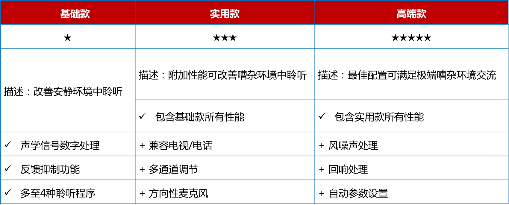 <span style="font-size:16px;"> 助聽器價格取決于機器的檔次,而檔次由內含的技術種類決定。助聽器檔次大致可分為基礎款、實用款、高端款。這三種檔次的區別請參見下表:</span></p><p style="text-align: center;"><span style="font-size:16px;"><img src="/upfiles/201808150226553383.png" width="640" alt="" /><br /></span></p><p><span style="font-size:16px;"> 那么,如何應該選擇哪種檔次的助聽器呢?</span></p><p><span style="font-size:16px;"> 選擇助聽器時主要需要考慮兩大因素。首先要考慮的就是弱聽人士的聽力損失程度,其次要考慮的就是弱聽人士的日常生活方式。比方說,某位弱聽人士是中度聽力損失,日常在家為主,那么實用款檔次助聽器通常可以滿足TA的需求。</span></p><p><span style="font-size:16px;"> 當然,這里只是為助聽器選配提供了大致方向,如何選配仍然需要具體情況具體分析,最好還是需要跟驗配師面對面溝通。</span></p><p><span style="font-size:16px;"> 1、高端款助聽器</span></p><p><span style="font-size:16px;"> 不同廠家的高端款助聽器均代表了各自的尖端技術,并致力于提供最佳的音質。</span></p><p><span style="font-size:16px;"> 這類助聽器高端之處在于自動適應各種聆聽環境,最優化佩戴者的聆聽清晰度和舒適度,讓佩戴者在極度嘈雜的環境中,如咖啡館,也能清晰地聽到同伴的言語聲。常見性能包括:</span></p><p><span style="font-size:16px;"> (1) 多種外觀、顏色可選;</span></p><p><span style="font-size:16px;"> (2) 環境自適應;</span></p><p><span style="font-size:16px;"> (3) 360°信號追蹤;</span></p><p><span style="font-size:16px;"> (4) 兼容各種藍牙設備。</span></p><p><span style="font-size:16px;"> 高端款助聽器為什么能夠自動適應各種聆聽環境呢?這是因為左右兩側的高端款助聽器能夠相互“通電報”,精準判斷所處的聆聽環境并自主學習,給出最佳的助聽設置。</span></p><p><span style="font-size:16px;"> 比如,您經常出入一家書店,每次您進入這家書店時總是習慣性地將音量調低2分貝;長此以往,當您再次進入該書店時,兩臺助聽器將會默契地降低2分貝。</span></p><p><span style="font-size:16px;"> 360°信號追蹤可以幫助佩戴者建立更佳的空間感知,對所處環境有充足的把控和預判,避免一些潛在的危險。而當助聽器連接至各種藍牙設備時,聆聽清晰度會更高,且不會打擾其他人。</span></p><p><span style="font-size:16px;"> 比如家人總是抱怨您把電視機聲音開得太大,拒絕跟您一起觀看電視時,您可以選配能夠兼容電視的助聽器,并進行獨立的音量調節,而家人只需設置為常規音量即可。高端款助聽器的價位一般在15000以上。</span></p><p style="text-align: center;"><span style="font-size:16px;"><img src="/upfiles/201808150228328500.jpg" alt="" /><br /></span></p><p><span style="font-size:16px;"> 2、實用款助聽器</span></p><p><span style="font-size:16px;"> 實用款助聽器的價格一般在8000~15000之間。實用款助聽器包含一定的降噪技術和言語提升功能,可以滿足大多數環境中的聆聽需求。部分廠家的實用款助聽器也可兼容各種藍牙設備。實用款助聽器的突出性能大致包括:</span></p><p><span style="font-size:16px;"> (1) 可連接外接音源;</span></p><p><span style="font-size:16px;"> (2) 言語清晰度提升;</span></p><p><span style="font-size:16px;"> (3) 方向性功能。</span></p><p><span style="font-size:16px;"> 3、基礎款助聽器</span></p><p><span style="font-size:16px;"> 基礎款助聽器的價位一般在8000以下。基礎款助聽器能夠滿足安靜環境中的交流需求,并具備反饋管理功能。反饋管理功能能夠有效提升佩戴舒適度,避免在日常佩戴過程中出現尖銳的干擾聲。</span></p><p><span style="font-size:16px;"> 基礎款助聽器適用于經常在家的弱聽人士,若是生活方式比較豐富多彩的弱聽人士建議選配其他檔次的助聽器。實用款助聽器的突出性能大致包括:</span></p><p><span style="font-size:16px;"> (1) 數字信號處理技術;</span></p><p><span style="font-size:16px;"> (2) 反饋管理功能;</span></p><p><span style="font-size:16px;"> (3) 多種聆聽程序可選。</span></p><p><span style="font-size:16px;"> 更多詳情請登錄www.yskoucai.com。</span></p>" />